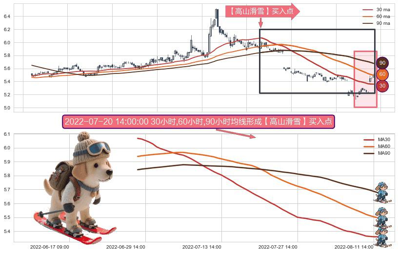⚀ 2022-06-28 14:00:00小时-2022-08-12 13:00:00小时显现 30小时-60小时-90小时均线 【高山滑雪】买入点 看多信号,后市看涨,买入