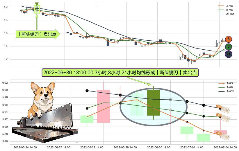 ⚀ 2022-06-30 13:00:00小时显现 3小时-8小时-21小时均线 【断头铡刀】卖出点 看空信号,后市看跌,卖出