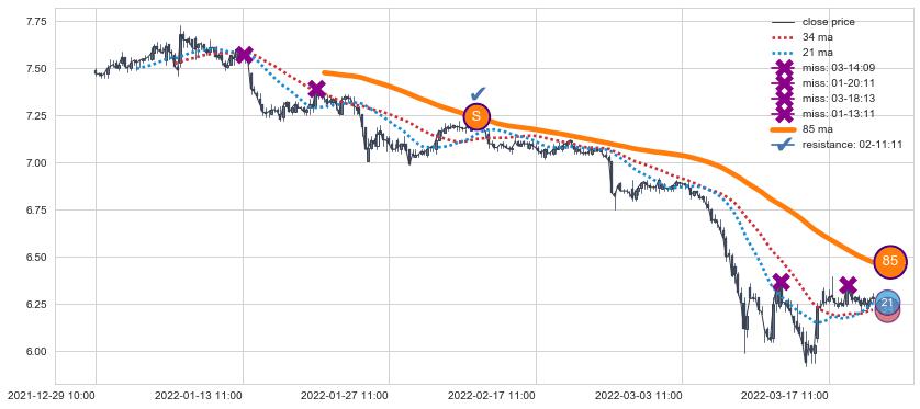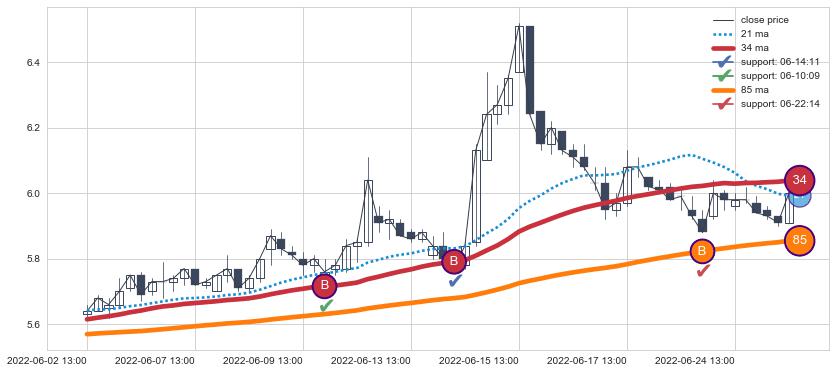 ⚅ 均线向上突破后,2022-06-15 13:00:00-小时价格上探超过 正乖离率超卖第三卖点 :8.326378719220545后开始止涨下跌再次均线破位