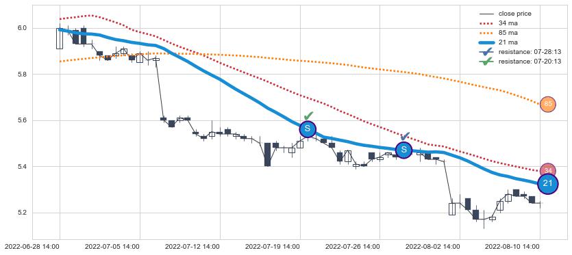 ⚂ 2022-06-09 09:00:00-小时均线向上突破,2022-07-07 13:00:00-小时重新下穿均线破位,均线阻力再次生效