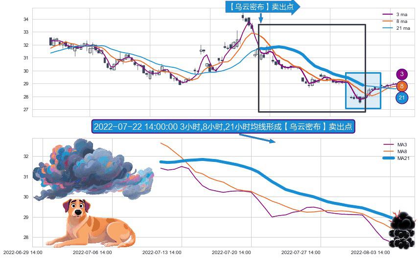 形态多维评估: ⚀ 2022-07-12 13:00:00小时-2022-08-04 13:00:00小时显现 3小时-8小时-21小时均线 【乌云密布】卖出点 看空信号,后市看跌,卖出