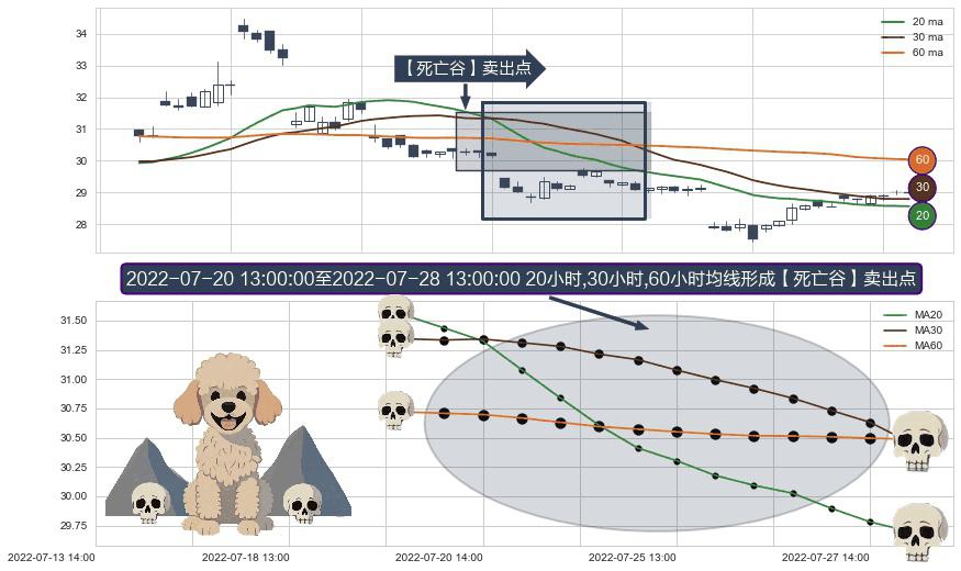 形态多维评估: ⚀ 2022-07-20 14:00:00-小时至2022-07-28 13:00:00-小时显现 20小时-30小时-60小时均线 【死亡谷】卖出点 看空信号,后市看跌,卖出