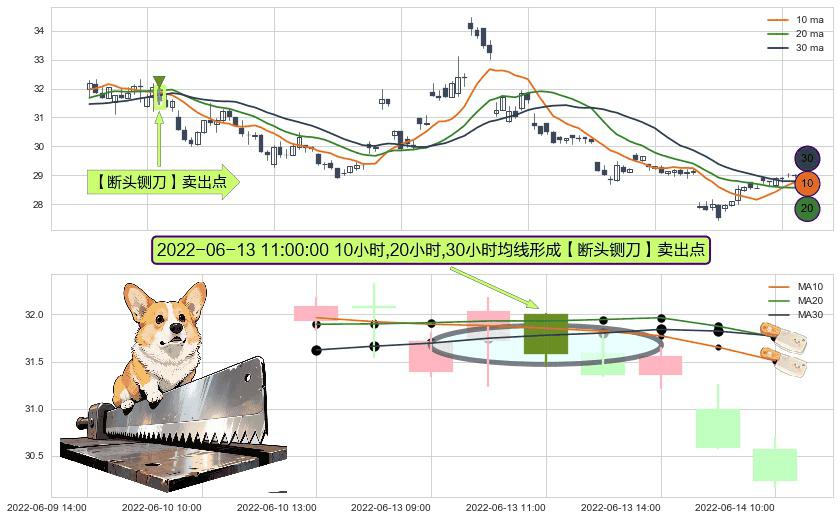 形态多维评估: ⚀ 2022-06-13 11:00:00小时显现 10小时-20小时-30小时均线 【断头铡刀】卖出点 看空信号,后市看跌,卖出