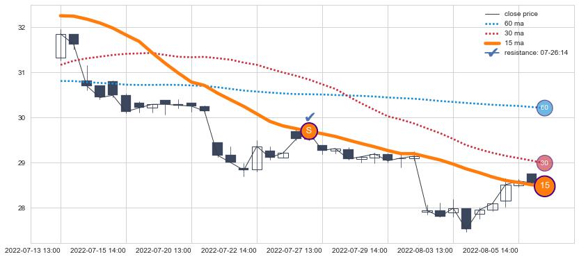 下跌趋势07-13 13:00-08-09 14:00,均线15确认关键阻力1处
