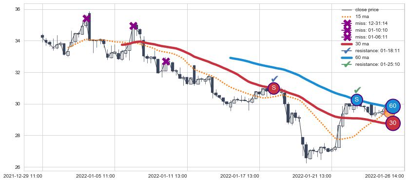 下跌趋势12-29 11:00-01-26 14:00,均线60, 30确认关键阻力2处