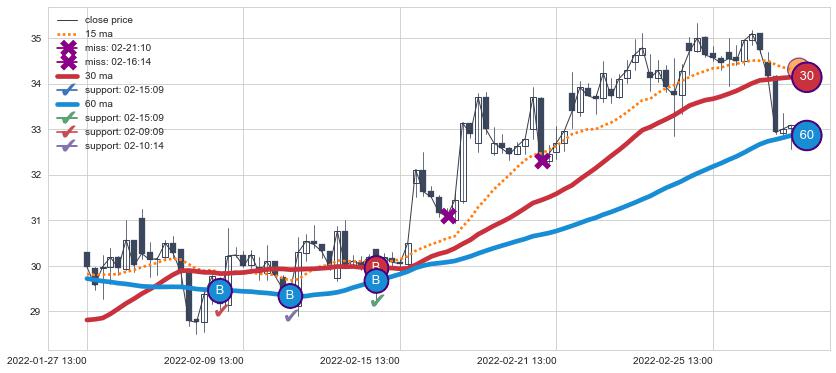 上涨趋势01-27 13:00-03-01 13:00,均线60, 30确认关键支撑3处