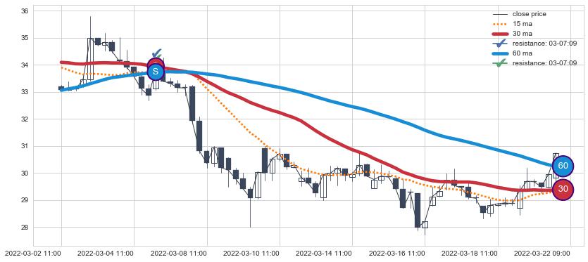 下跌趋势03-02 11:00-03-22 09:00,均线60, 30确认关键阻力1处