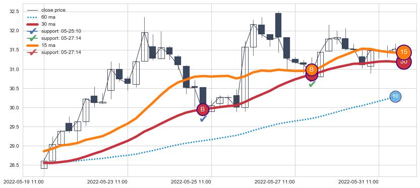 上涨趋势05-19 11:00-05-31 14:00,均线30, 15确认关键支撑2处