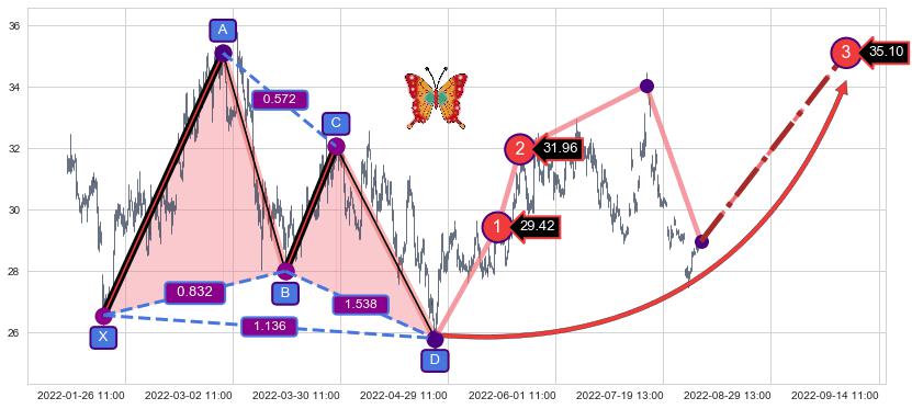 ➣ 已完成【蝴蝶】形态起点X: 01-20:10, 终点D: 04-27:09, 共309交易小时