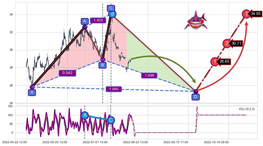 ➢ 距离预测D点位置尚有下跌空间,短线依然【看跌】, 耐心等待看涨【鲨鱼】形态反转启动