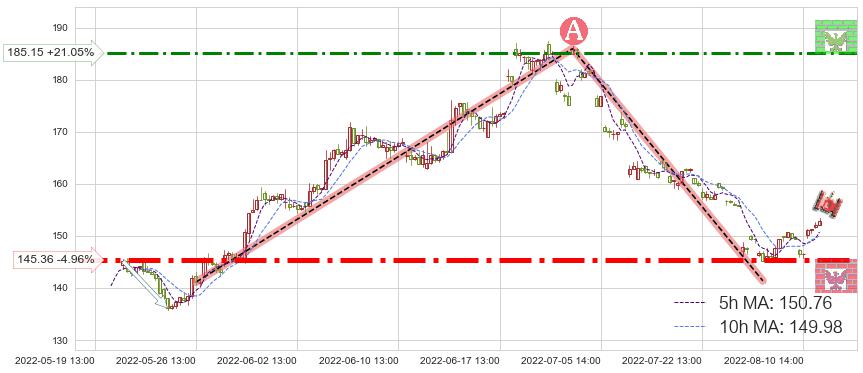 ♘ 阻力价格位185.15,可信任强度58.58%,距离最后交易2022-08-12 14:00形成的收盘价格152.95相差 +21.05%