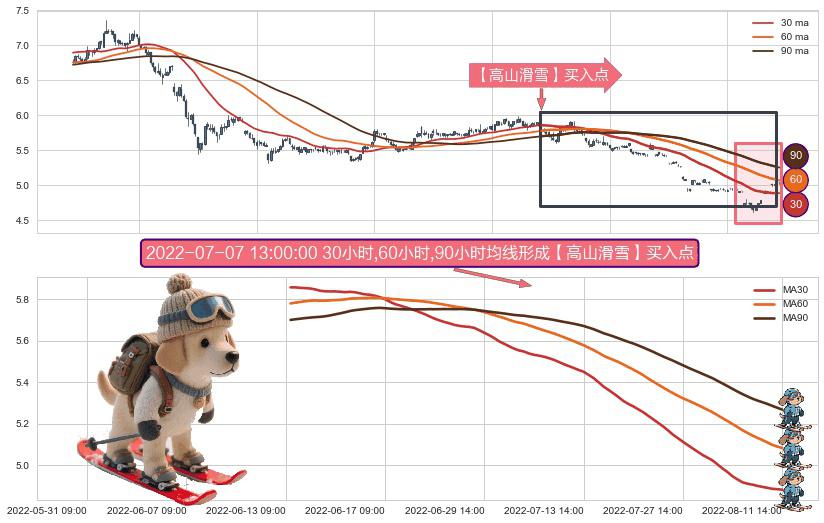 ⚀ 2022-06-13 10:00:00小时-2022-08-11 14:00:00小时显现 30小时-60小时-90小时均线 【高山滑雪】买入点 看多信号,后市看涨,买入