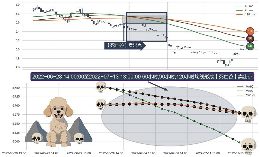⚀ 2022-06-29 13:00:00-小时至2022-07-13 13:00:00-小时显现 60小时-90小时-120小时均线 【死亡谷】卖出点 看空信号,后市看跌,卖出