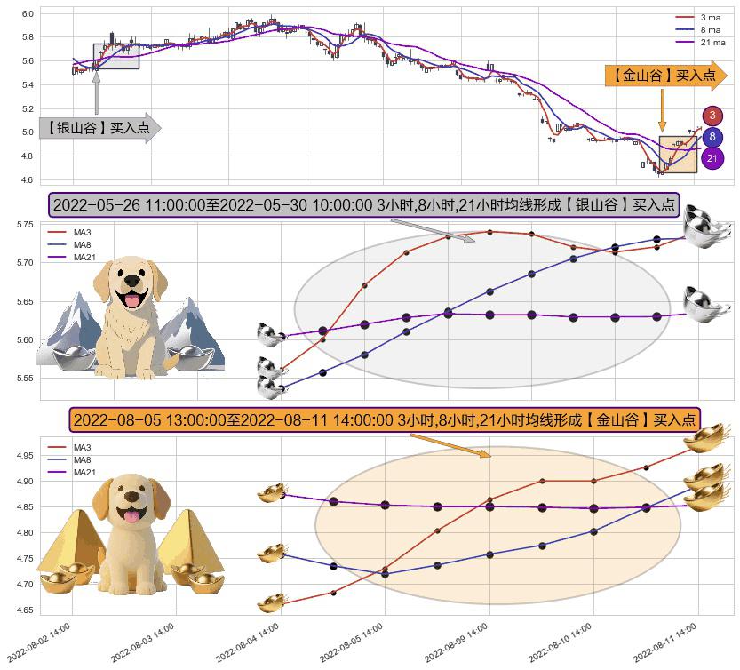 ⚄ 2022-08-05 14:00:00-小时至2022-08-11 14:00:00-小时显现 3小时-8小时-21小时均线 【金山谷】买入点 其再次确认了买入信号,可靠性更强,买入