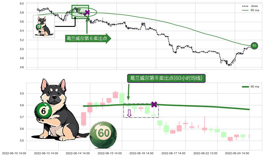 ⚀ 2022-06-16 09:00:00-小时显现 葛兰威尔均线 60小时均线 第⑥卖出点 走势反转见顶信号,后市看跌,卖出信号