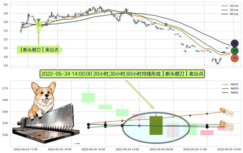 ⚀ 2022-05-24 14:00:00小时显现 20小时-30小时-60小时均线 【断头铡刀】卖出点 看空信号,后市看跌,卖出