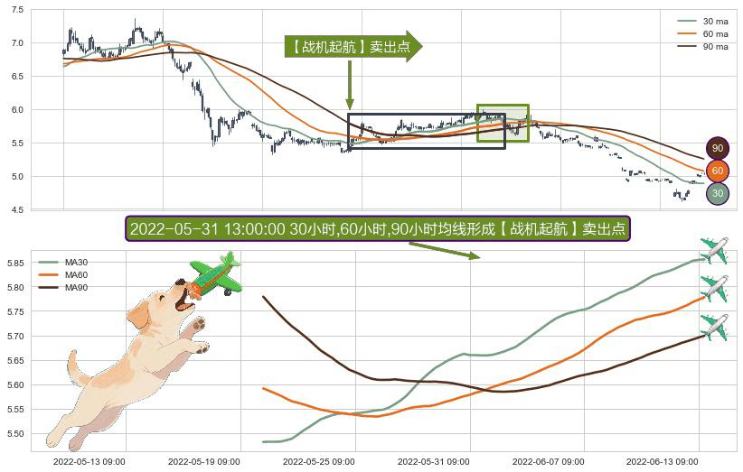 ⚀ 2022-05-19 14:00:00小时-2022-06-13 10:00:00小时显现 30小时-60小时-90小时均线 【战机起航】卖出点 看空信号,后市看跌,卖出