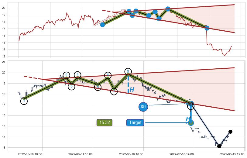 从2022-05-23 14:00至2022-08-12 13:00,共包含168个小时,阶段股价下跌-29.10%,阶段股价变动位移路程比: 1 : 5,下跌趋势角度: 45.4,2022-07-15 13:00向↘︎形成缺口,跳空下跌-15.09%˚