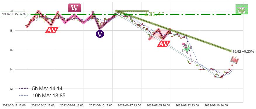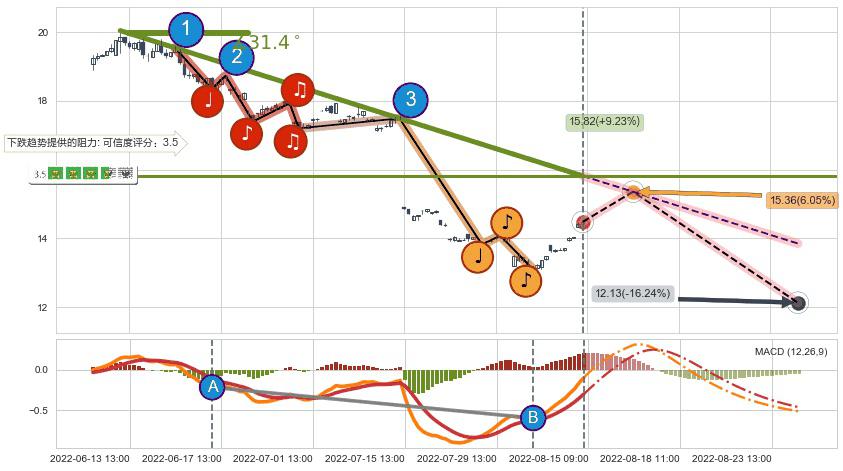 ♘ 在最后的下跌阶段2022-06-13 10:00至2022-08-12 13:00,存在 持续未破位的阻力位 ,阻力价格15.82,可信任强度78.95%,其距离最后价格14.48相差 +9.23%