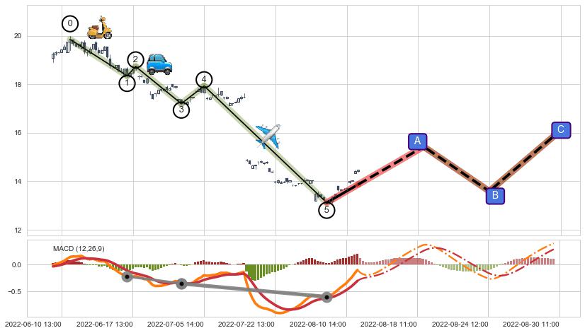 | 3 🅚:【高山滑雪】买入点 ➕ 🌊:波浪理论猜想下跌浪5已形成,猜想后续形成abc反弹上涨(均值回复) ☞ 看多信号 ⇥ 【均线】交织【图形】⇥ 综合量化分数: 52 | > |