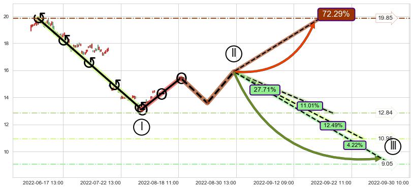 ➢ 循环浪继续向下【最高】位置(09-19:13, 12.84),匹配聚类样本比例39.72%, 可能性概率11.01%