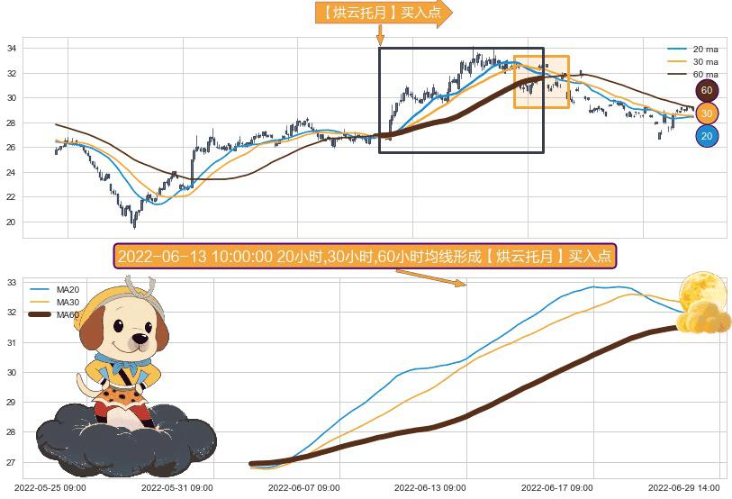 ⚀ 2022-06-01 10:00:00小时-2022-06-27 14:00:00小时显现 20小时-30小时-60小时均线 【烘云托月】买入点 看多信号,后市看涨,买入