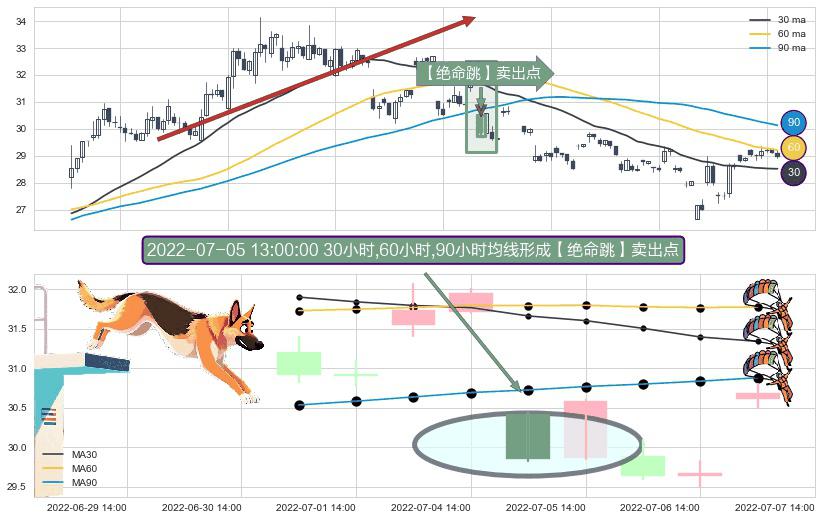 ⚀ 2022-07-05 13:00:00小时显现 30小时-60小时-90小时均线 【绝命跳】卖出点 看空信号,后市看跌,卖出