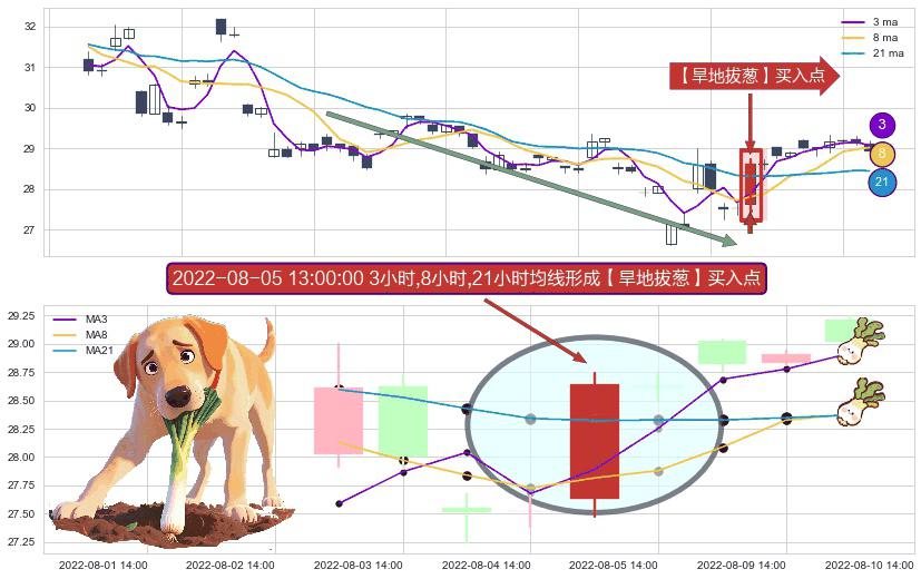 ⚀ 2022-08-05 13:00:00小时显现 3小时-8小时-21小时均线 【旱地拔葱】买入点 看多信号,后市看涨,买入