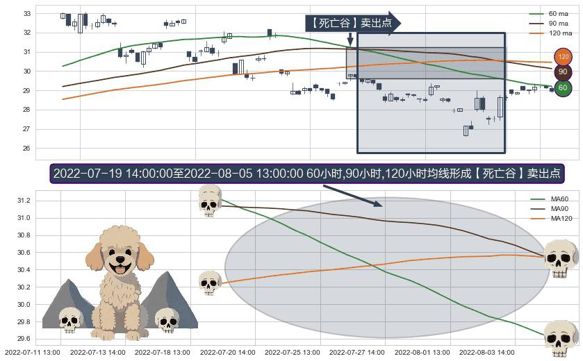 ⚀ 2022-07-20 13:00:00-小时至2022-08-05 13:00:00-小时显现 60小时-90小时-120小时均线 【死亡谷】卖出点 看空信号,后市看跌,卖出