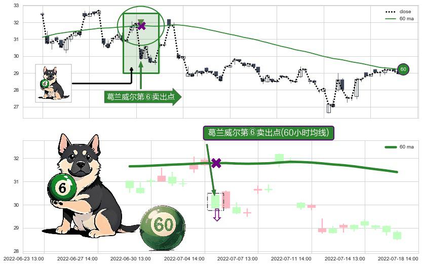 ⚀ 2022-07-05 13:00:00-小时显现 葛兰威尔均线 60小时均线 第⑥卖出点 走势反转见顶信号,后市看跌,卖出信号