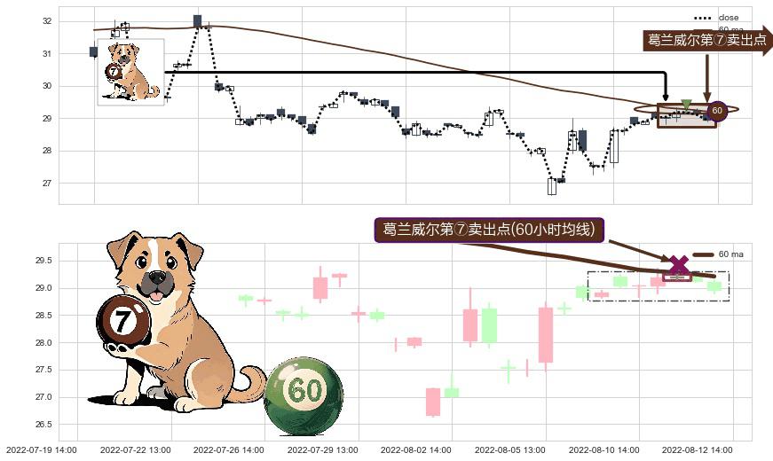 ⚀ 2022-08-11 14:00:00-小时显现 葛兰威尔均线 60小时均线 第⑦卖出点 下降趋势的中继信号,后市看跌,卖出信号