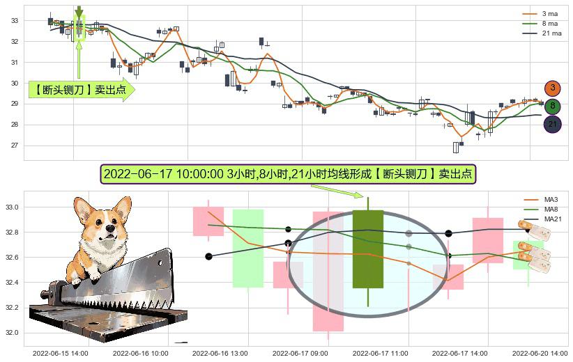 ⚀ 2022-06-17 10:00:00小时显现 3小时-8小时-21小时均线 【断头铡刀】卖出点 看空信号,后市看跌,卖出