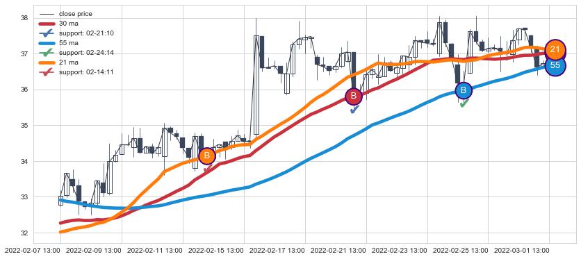 ⚀ 2022-06-20 14:00:00小时-2022-08-12 14:00:00小时显现 30小时-60小时-90小时均线 【高山滑雪】买入点 看多信号,后市看涨,买入