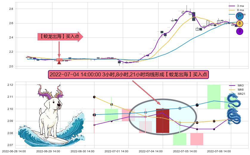 ⚀ 2022-07-04 14:00:00小时显现 3小时-8小时-21小时均线 【蛟龙出海】买入点 看多信号,后市看涨,买入