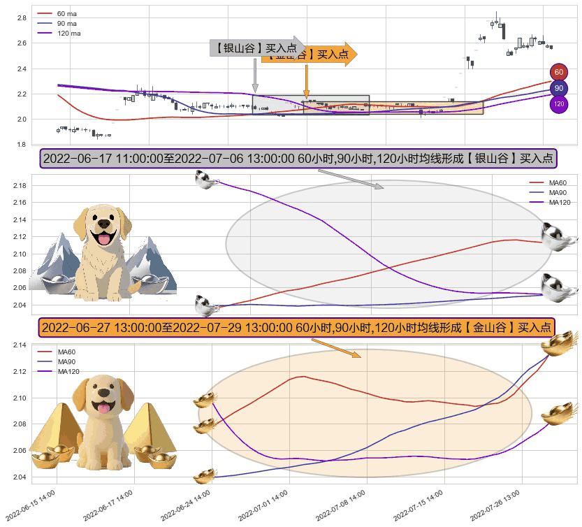 ⚃ 2022-06-27 14:00:00-小时至2022-07-29 13:00:00-小时显现 60小时-90小时-120小时均线 【金山谷】买入点 其再次确认了买入信号,可靠性更强,买入