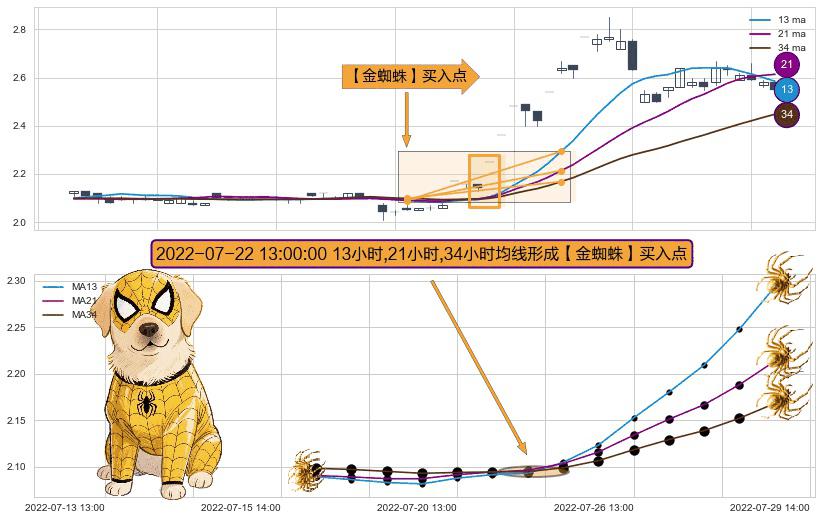 ⚀ 2022-07-22 13:00:00小时显现 13小时-21小时-34小时均线 【金蜘蛛】买入点 看多信号,后市看涨,买入