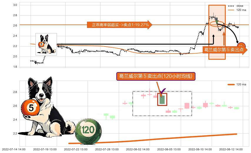 ⚀ 2022-08-03 14:00:00-小时显现 葛兰威尔均线 120小时均线 第⑤卖出点 上升趋势均值回复的短线回落信号,后市看跌,卖出信号