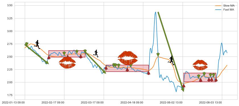 03-18 10:00至04-20 14:00 慢线与快线多次接触,存在上下穿越,有缠绕