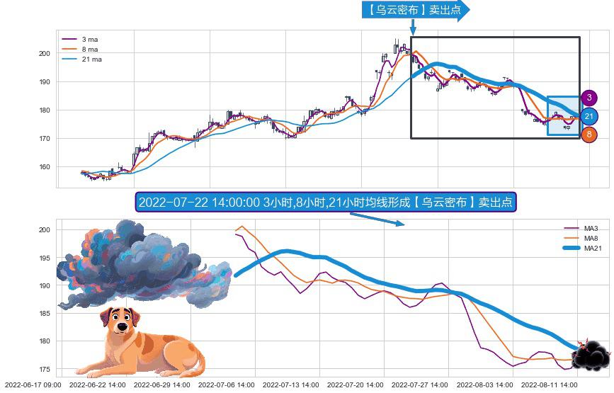 ⚀ 2022-07-05 13:00:00小时-2022-08-12 13:00:00小时显现 3小时-8小时-21小时均线 【乌云密布】卖出点 看空信号,后市看跌,卖出