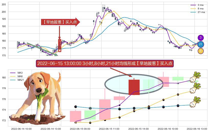 ⚀ 2022-06-15 13:00:00小时显现 3小时-8小时-21小时均线 【旱地拔葱】买入点 看多信号,后市看涨,买入