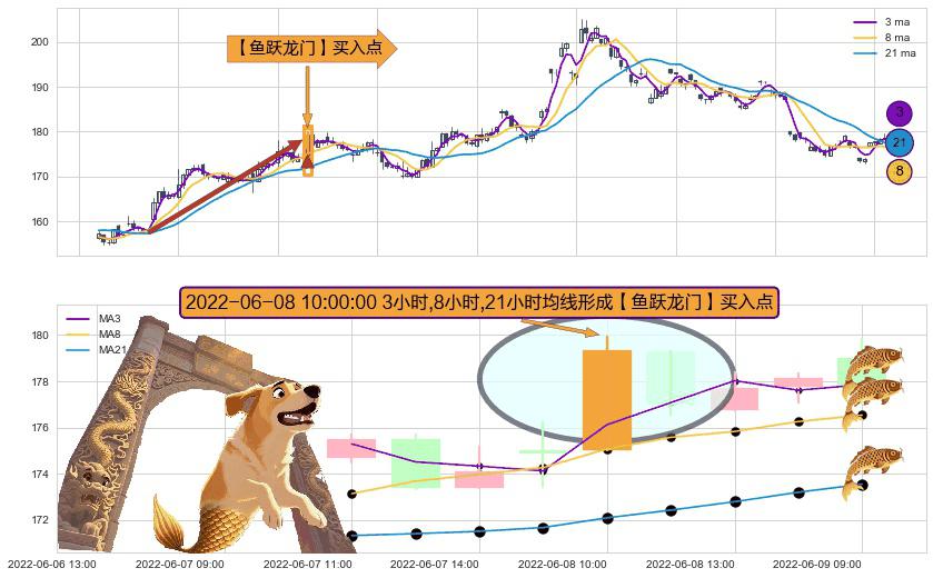 ⚀ 2022-06-08 10:00:00小时显现 3小时-8小时-21小时均线 【鱼跃龙门】买入点 看多信号,后市看涨,买入