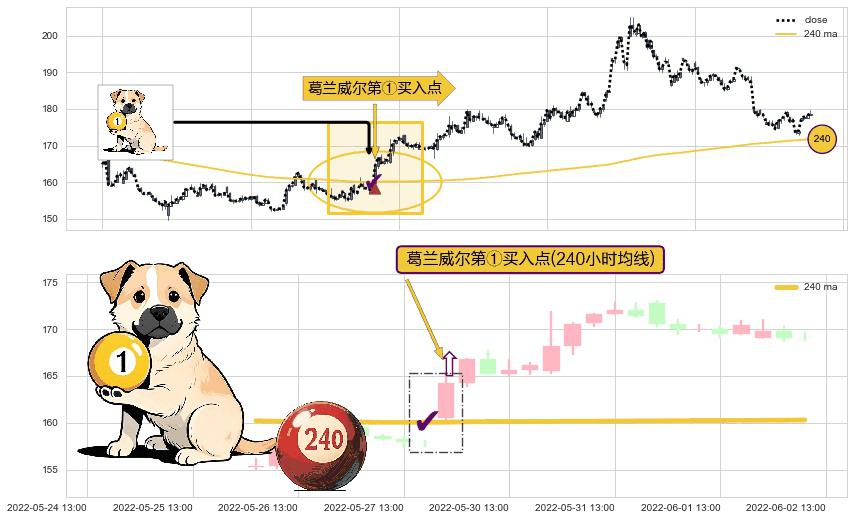 ⚀ 2022-05-30 09:00:00-小时显现 葛兰威尔均线 240小时均线 第买①入点 走势反转见底信号,后市看涨,买进信号