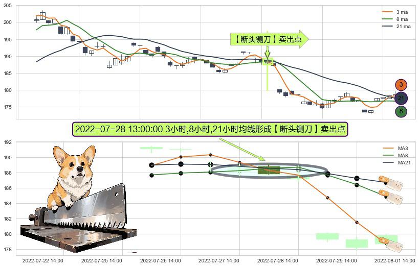 ⚀ 2022-07-28 13:00:00小时显现 3小时-8小时-21小时均线 【断头铡刀】卖出点 看空信号,后市看跌,卖出