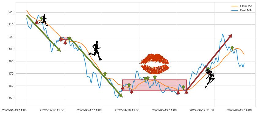 01-13 11:00至02-15 13:00 慢线与快线呈空头排列, 慢线与快线接触少,无缠绕