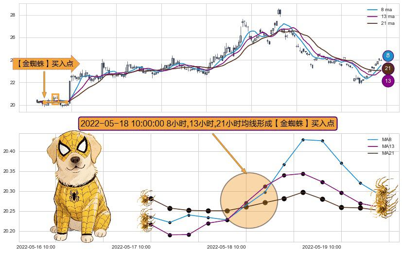 ⚀ 2022-05-18 10:00:00小时显现 8小时-13小时-21小时均线 【金蜘蛛】买入点 看多信号,后市看涨,买入
