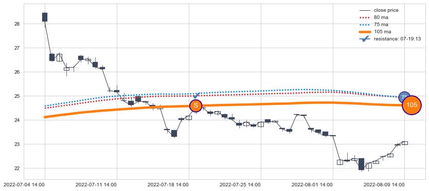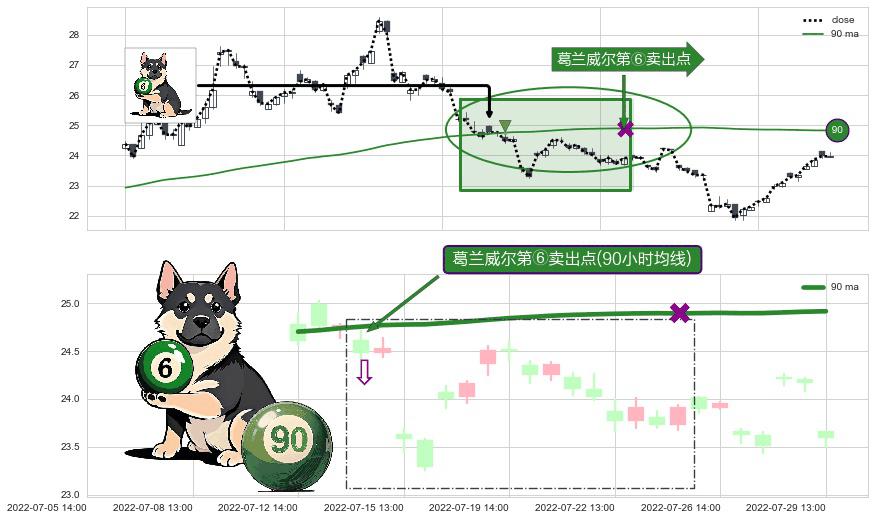 ⚀ 2022-07-14 13:00:00-小时显现 葛兰威尔均线 90小时均线 第⑥卖出点 走势反转见顶信号,后市看跌,卖出信号