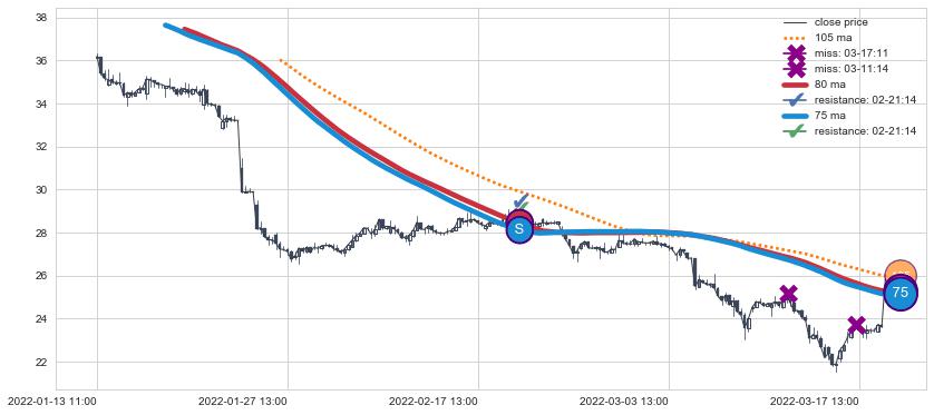 ⚅ 卖点向下突破均线后,价格走势有持续向下的迹象,但动能稍显不足,迟迟不能远离均线