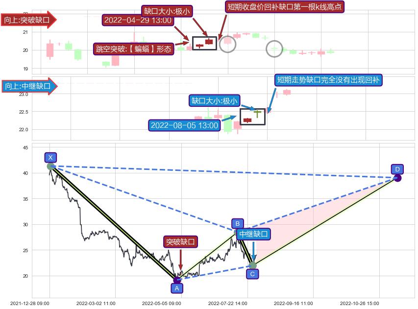 ➢ 突破缺口形成后,后续k已经超过14根,跳空突破【蝙蝠】形态关键点后, 出现【完全回踩】迹象,短期收盘价回补缺口第一根k线高点