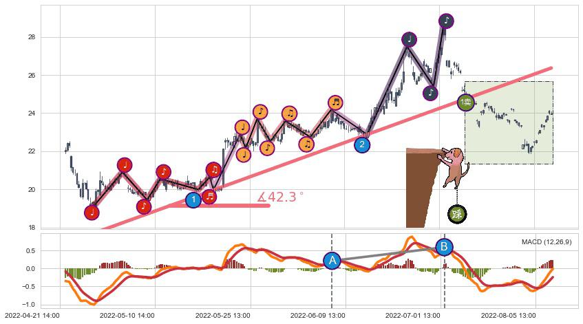 从2022-04-27 11:00至2022-07-15 13:00,共包含203个小时,阶段股价上涨23.39%,阶段股价变动位移路程比: 1 : 9,上涨趋势角度: 42.3