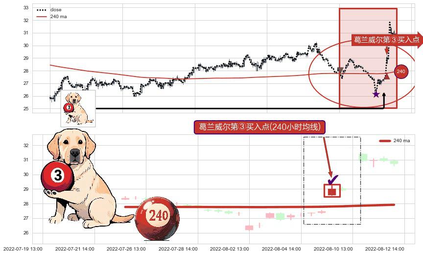 形态多维评估: ⚀ 2022-08-09 13:00:00-小时显现 葛兰威尔均线 240小时均线 第③买入点 上升趋势的中继信号,后市看涨,买进信号